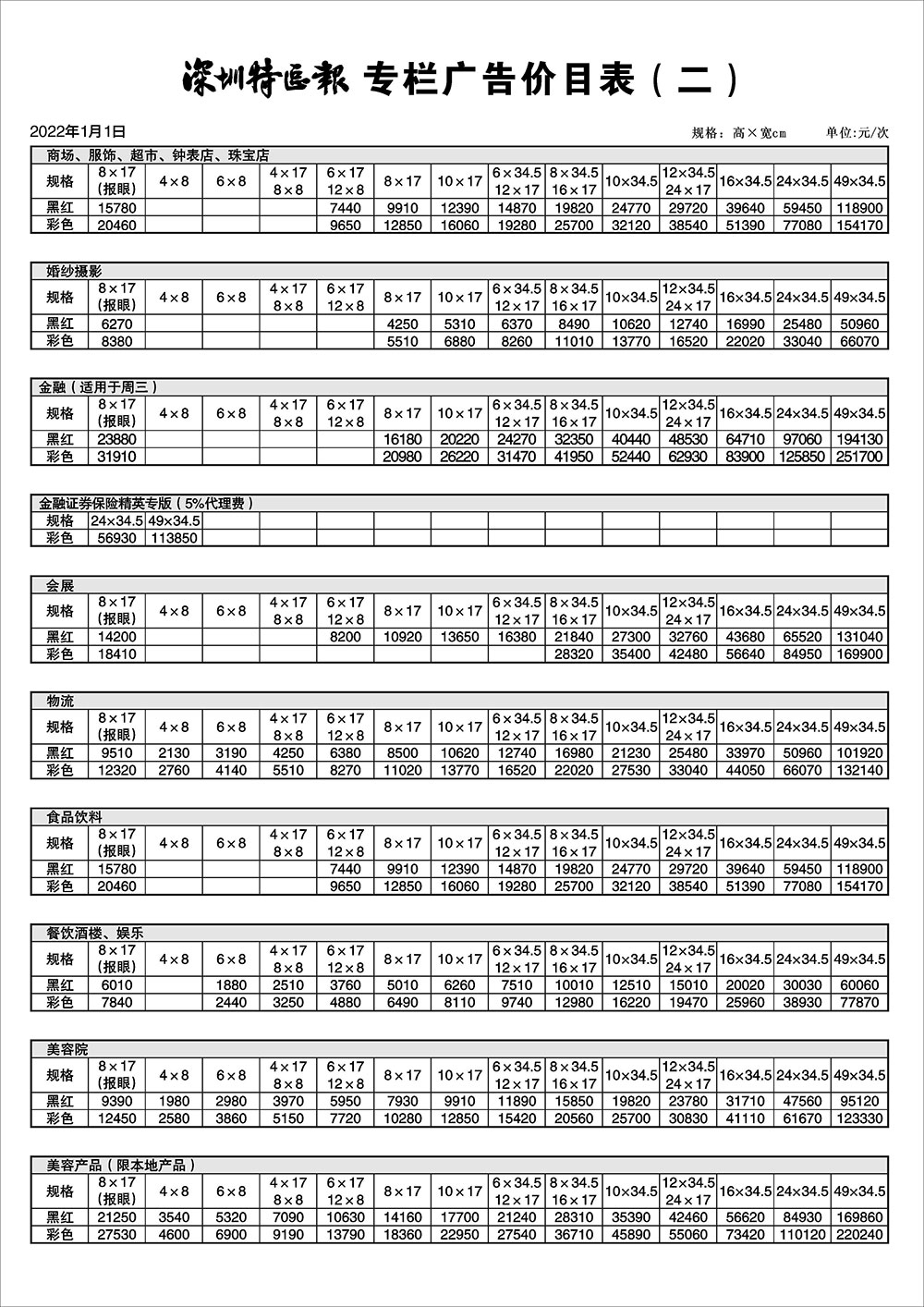 深圳特區(qū)報工商廣告價目表