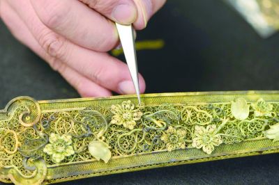 作為燕京八絕之一的花絲鑲嵌工藝,2000多年來一直為宮廷御用?;ńz鑲嵌工藝又稱細金工藝,是將金、銀、銅等抽成細絲,以堆壘編織等技法制成。鑲嵌則是把金銀薄片打成器皿,然后鏨出圖案,或用鎪弓鎪出圖案,并鑲嵌寶石而成。