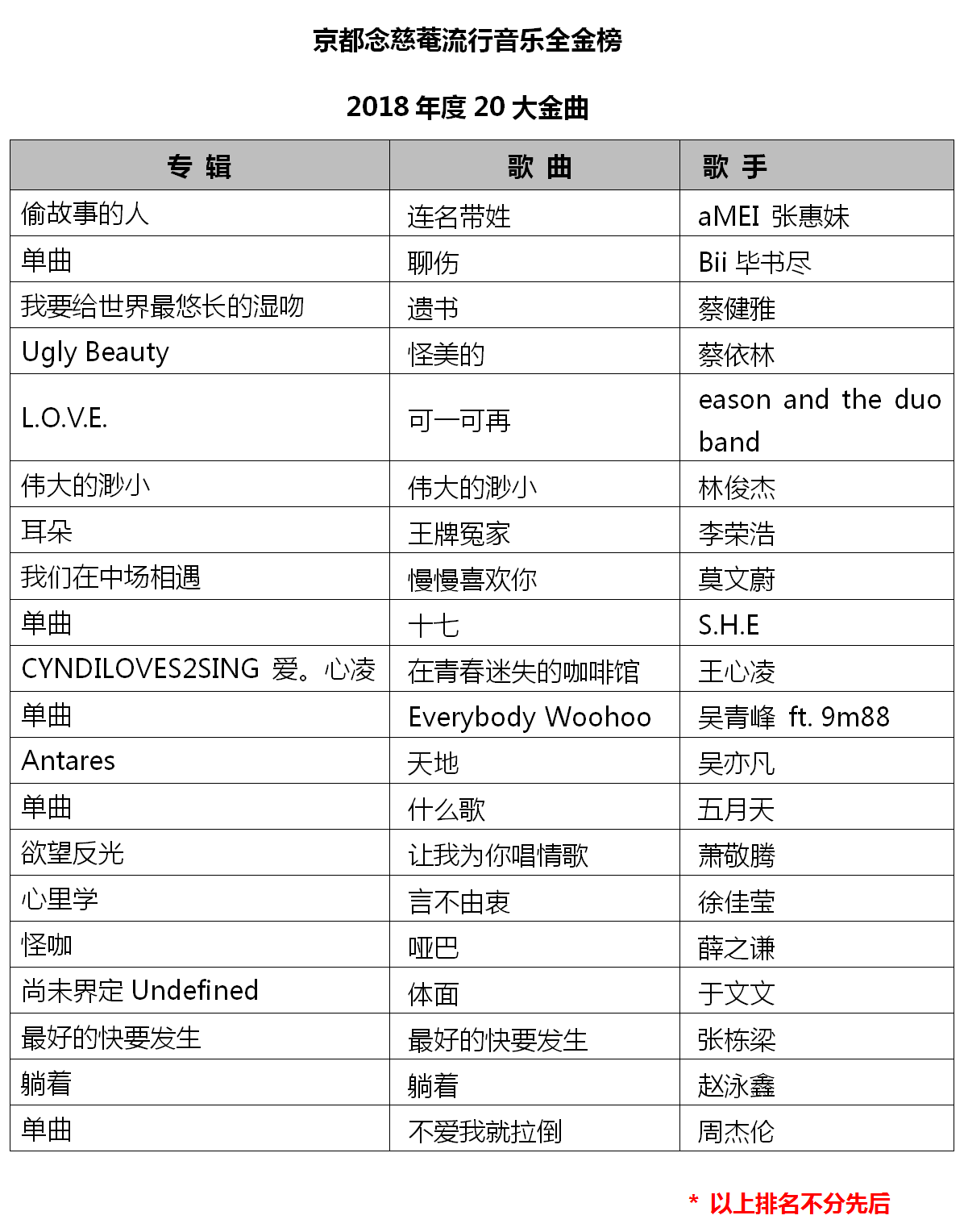 憑著專輯《垂直活著,水平留戀著?!分鞔蚋枨禙orever Young》,在京都念慈菴·流行音樂(lè)全金榜榜單中霸榜十周的艾怡良,實(shí)力入圍“年度最受歡迎創(chuàng)作歌手”。除此外,毛不易、趙泳鑫、陳綺貞、蕭秉治、于文文、白安、王笠人均有入圍。