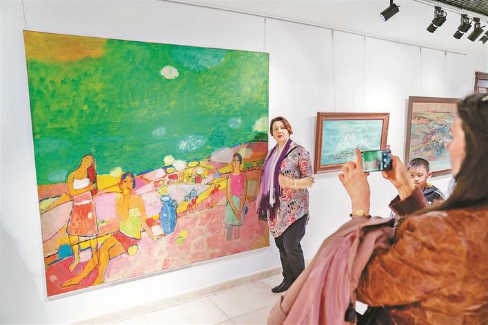 參觀者在油畫(huà)展上留影。新華社發(fā)