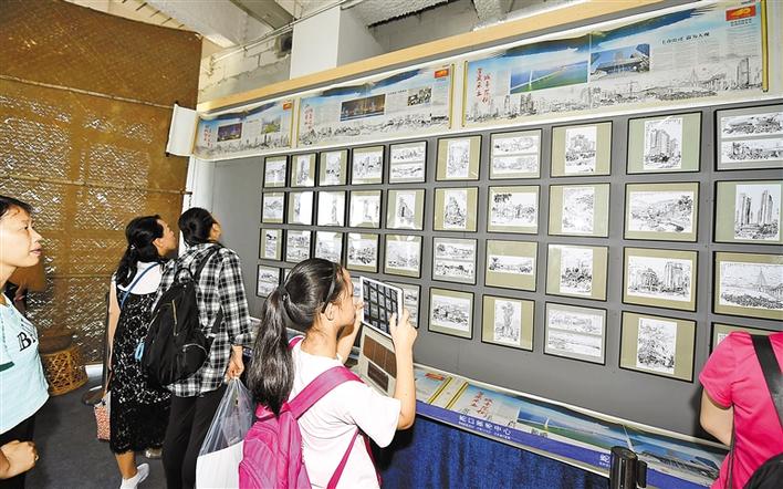 在現(xiàn)場(chǎng)的攝影作品、速寫作品上方,展示的于2018年12月8日《深圳商報(bào)》刊出的、中國(guó)報(bào)業(yè)印刷史上罕見的20連版、改革開放四十年紀(jì)念版圖繪新聞長(zhǎng)卷,瞬間抓住了觀眾的眼球。記者看到,《深圳商報(bào)》獨(dú)具創(chuàng)新的4連版、5組(共20個(gè)版)的特殊設(shè)計(jì)版式,內(nèi)容以深圳美麗的風(fēng)光圖片和深圳媒體人馮明《鵬城百景速寫》的繪畫結(jié)合形式,展現(xiàn)了深圳在改革開放40年間的經(jīng)歷。