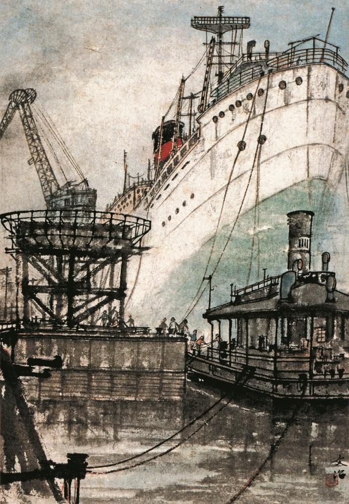 宋文治對(duì)廣東地區(qū)的關(guān)注始于20世紀(jì)的60年代。他在1960年參加江蘇國(guó)畫院組織的行程二萬(wàn)三千里的寫生活動(dòng)中,經(jīng)過(guò)廣州時(shí)就創(chuàng)作了《廣州造船廠》,罕見地運(yùn)用山水畫技法表現(xiàn)現(xiàn)代工業(yè)題材。