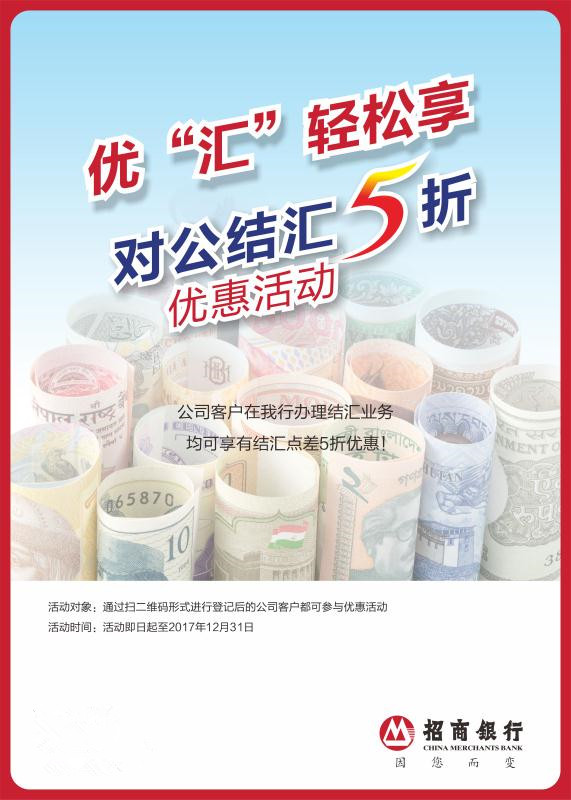 近日,記者從招行深圳分行了解到,自2017年8月1日至2017年年底,招商銀行深圳分行特別推出結(jié)匯尊享優(yōu)惠活動?;顒悠陂g,凡公司客戶,可在招商銀行深圳分行轄內(nèi)(含珠海分行及惠州分行)任一網(wǎng)點通過掃描指定二維碼進行登記,登記后辦理結(jié)匯業(yè)務(wù)即可享受結(jié)匯點差五折優(yōu)惠。(張怡)