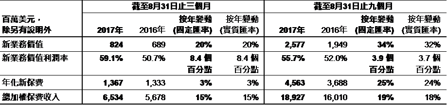 10月20日,友邦保險控股有限公司(港股代號:1299)公布截至2017年8月31日止的第三季度新業(yè)務價值增長20%。