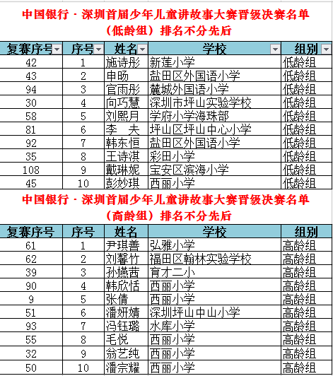 從全市近百所學校、社會賽區(qū)報名的萬余名參賽選手中脫穎而出的選手們齊聚復賽賽場,比賽競爭異常激烈。晉級復賽的225人(其中高齡組104人,低齡組121人)使出渾身解數(shù),講述著自己喜歡的故事,最終高、低齡組每組各10人晉級決賽,低齡組新蓮小學施詩彤、鹽田區(qū)外國語小學申旸等10位選手,高齡組弘雅小學尹琪善、福田區(qū)翰林實驗學校劉馨竹等10位選手“殺出重圍”,奪得決賽名額。