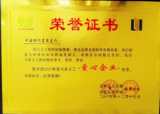 深圳新聞網(wǎng)訊 近日,深圳市龍崗區(qū)義工聯(lián)、龍崗圖書館書香義工2017年度總結(jié)大會(huì)在龍崗區(qū)文體中心召開。大會(huì)授予中國銀行深圳皇崗支行書香義工“愛心企業(yè)”稱號,并聯(lián)合頒發(fā)榮譽(yù)證書。