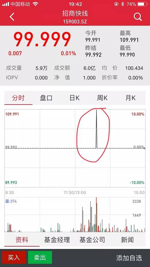 基金君大致講一下這個過程。2018年3月13日,招商保證金快線A在二級市場盤中價格出現(xiàn)了109.991的超高成交價,成交金額5511.95萬元,業(yè)內人士看來,這大概率是由“烏龍指”所致,不過,這不小心的手一抖,粗略估算就要浮虧約500萬,一套房就這么沒了。