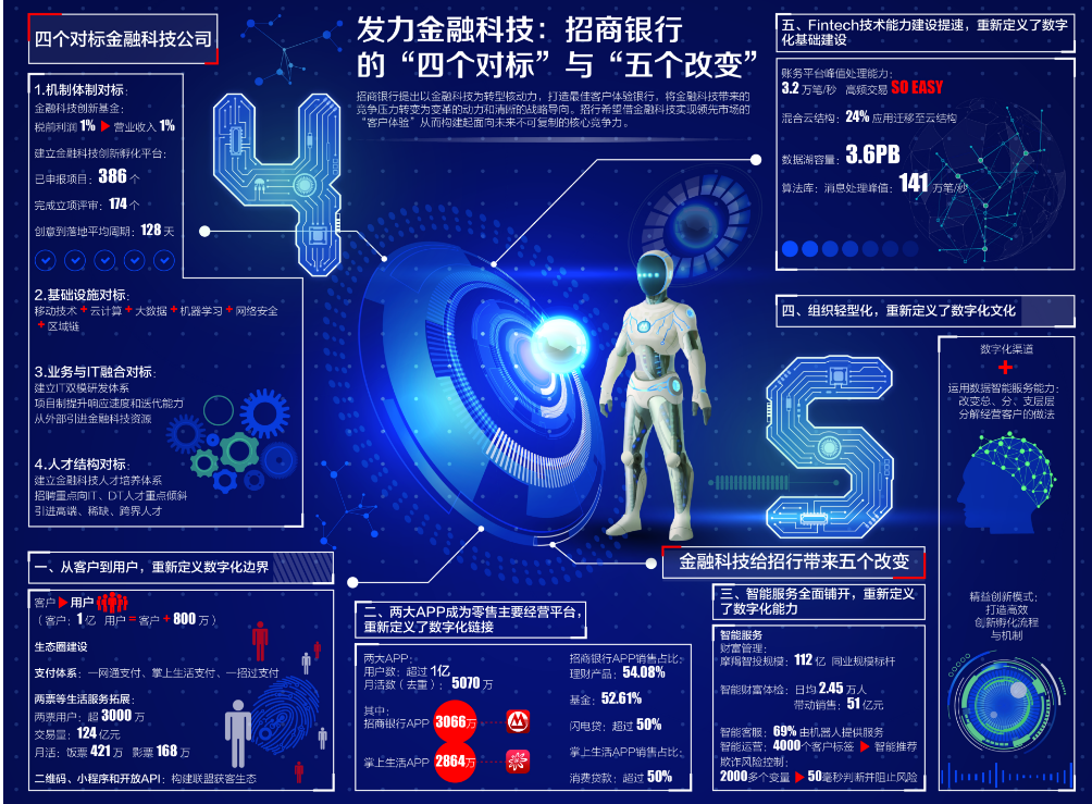 “關(guān)鍵不是我們擁有什么科技,而是我們怎么去運用科技,怎么運用金融科技的思維和精神?!?對于金融科技,招行董事會明確提出“容忍失敗,獎勵成功?!薄叭蒎e”文化對于經(jīng)營風(fēng)險,踐行審慎文化的銀行來說,可以說是顛覆式的。也就是說,招行為激勵創(chuàng)新,不僅打法在變革,理念及體制機制也都在轉(zhuǎn)變。