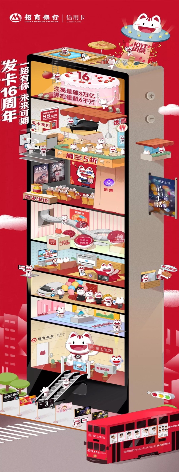 據(jù)悉,圖里這棟手機(jī)大廈,承載了招行信用卡和客戶們的共同回憶。各種靚麗的卡片、飯票、影票、旅游活動(dòng),承包了客戶們的吃喝玩樂;貼心的智能客服和 AI實(shí)驗(yàn)室,為客戶提供了溫暖的服務(wù);還有客戶們都熟悉的10元風(fēng)暴、水電煤等生活繳費(fèi)、智能助理、掌上商城、積分禮遇等。