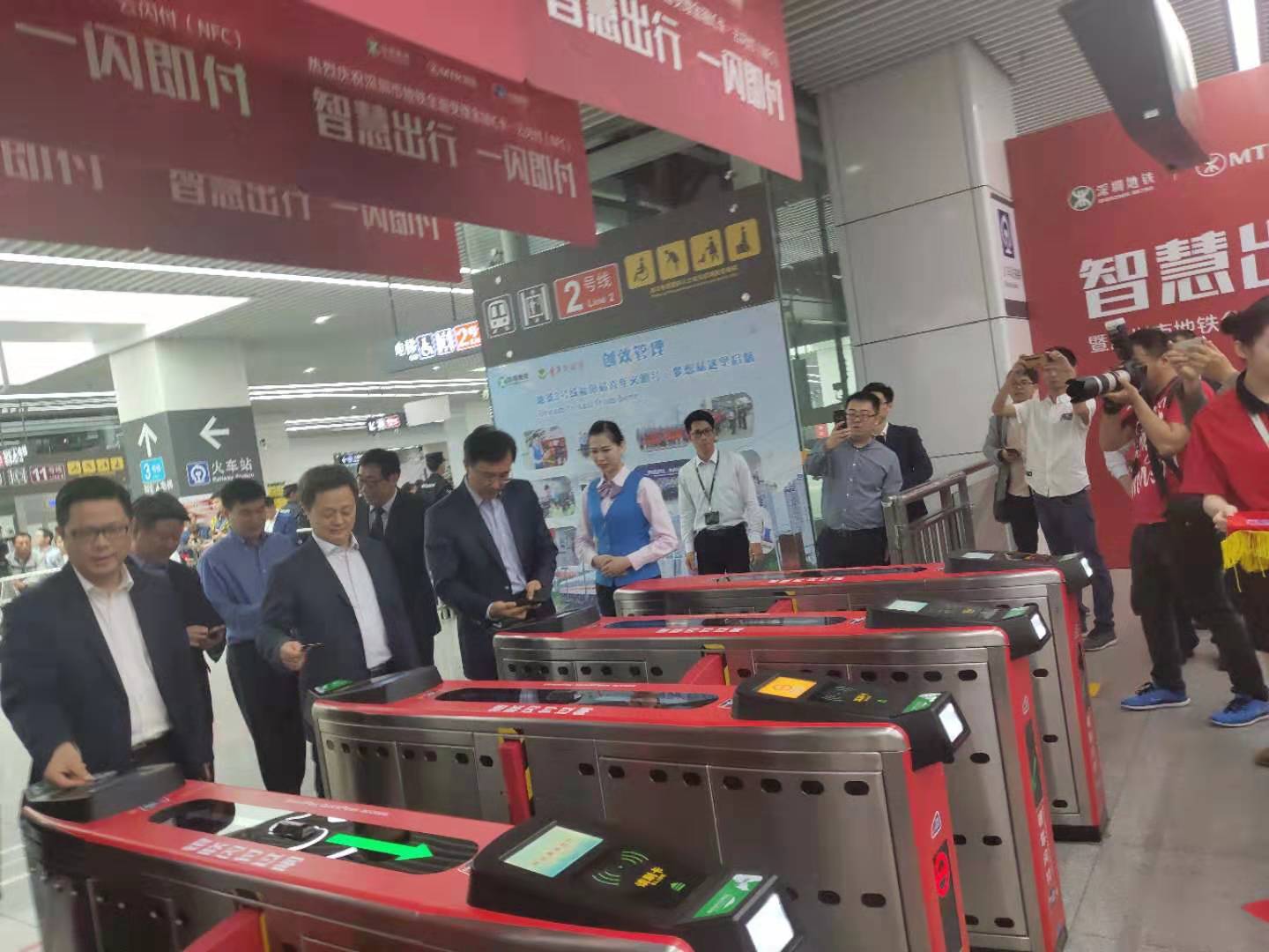 3月1日上午,五洲賓館內(nèi)舉行了“深圳市地鐵金融IC卡過閘服務(wù)”的啟動(dòng)儀式。中國人民銀行副行長范一飛、深圳市人民政府副市長艾學(xué)峰、招商銀行總行副行長劉建軍、中國銀聯(lián)董事長邵伏軍、招商銀行深圳分行行長岳鷹、深圳地鐵董事長辛杰、港鐵(深圳)總經(jīng)理黃琨暐等相關(guān)領(lǐng)導(dǎo)出席了啟動(dòng)儀式,并共同點(diǎn)亮LED燈幕,宣告深圳市地鐵8條線路的所有車站正式啟用過閘功能。