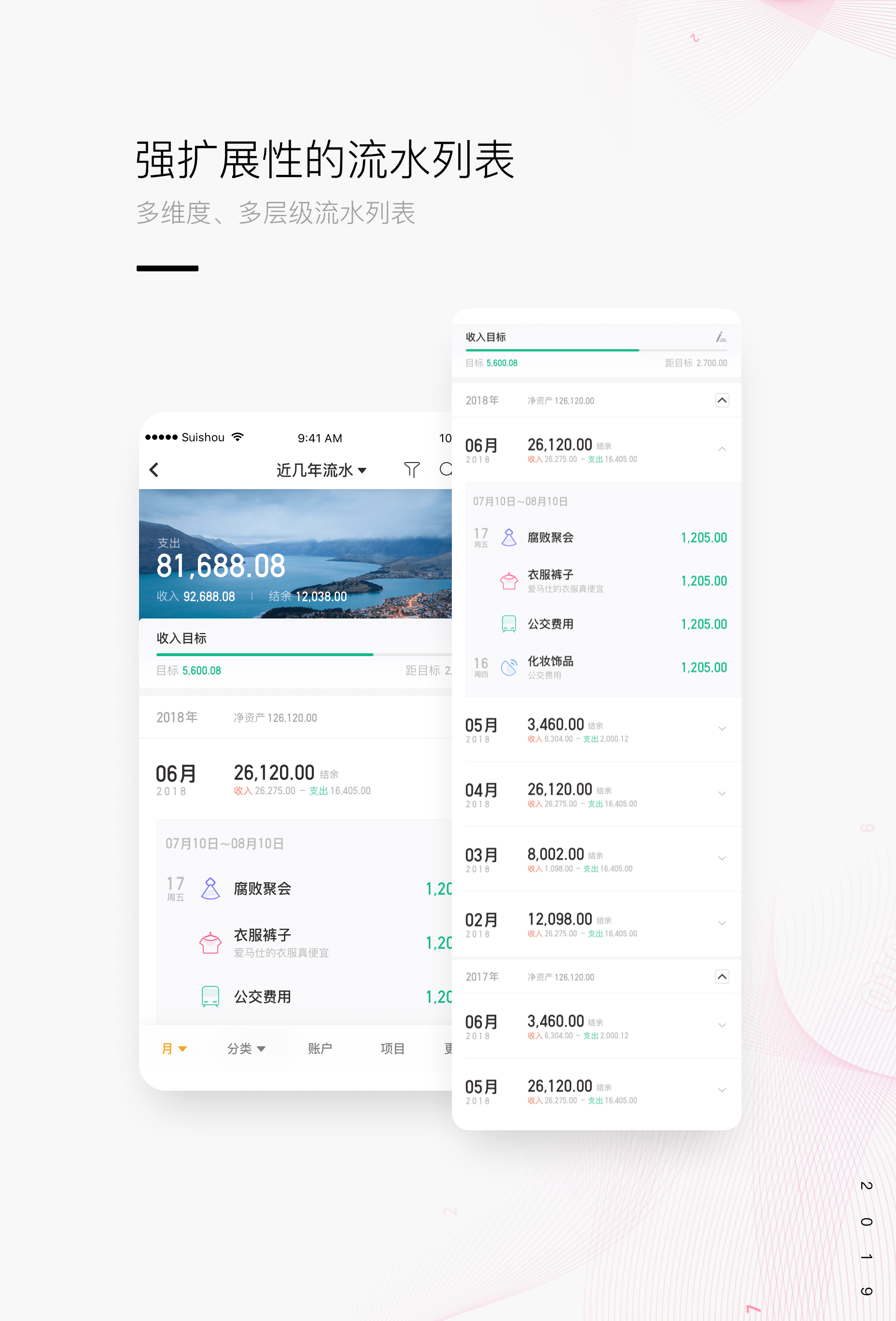 新版本還優(yōu)化了流水列表結(jié)構(gòu),凸顯層級區(qū)分,使內(nèi)容條目更清晰,向用戶呈現(xiàn)了更加直觀清楚的財(cái)務(wù)信息,方便用戶隨時(shí)掌握自己的財(cái)務(wù)狀況。