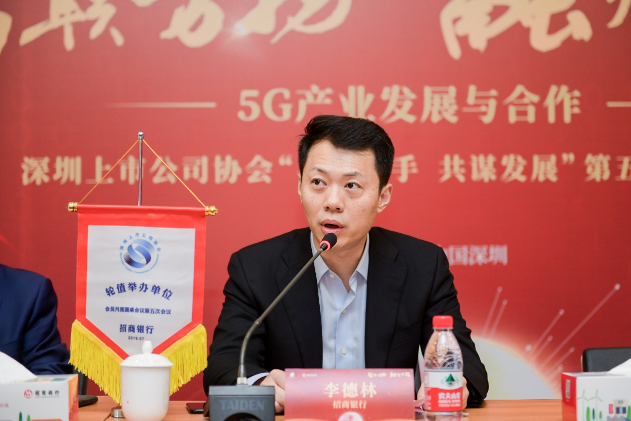 7月11日下午,由深圳上市公司協(xié)會牽頭、招商銀行股份有限公司主辦的“智聯(lián)萬物,融智有招——5G產(chǎn)業(yè)發(fā)展與合作”會員月度圓桌會議第五次會議在招商銀行深圳分行大廈3樓多功能廳成功舉行。深圳市證監(jiān)局處長梁文利、協(xié)會會長麥伯良、協(xié)會執(zhí)行副會長兼秘書長黃鐵軍、招商銀行總行行長助理李德林、總行董事會辦公室主任霍建軍等領(lǐng)導(dǎo)出席了本次活動,本次活動邀請了來自信息技術(shù)、制造、金融、地產(chǎn)等5 G行業(yè)的40家上市公司董事長、總經(jīng)理等60余人參加活動,行業(yè)專家齊聚一堂,共話5G發(fā)展浪潮中的機(jī)遇與挑戰(zhàn)。