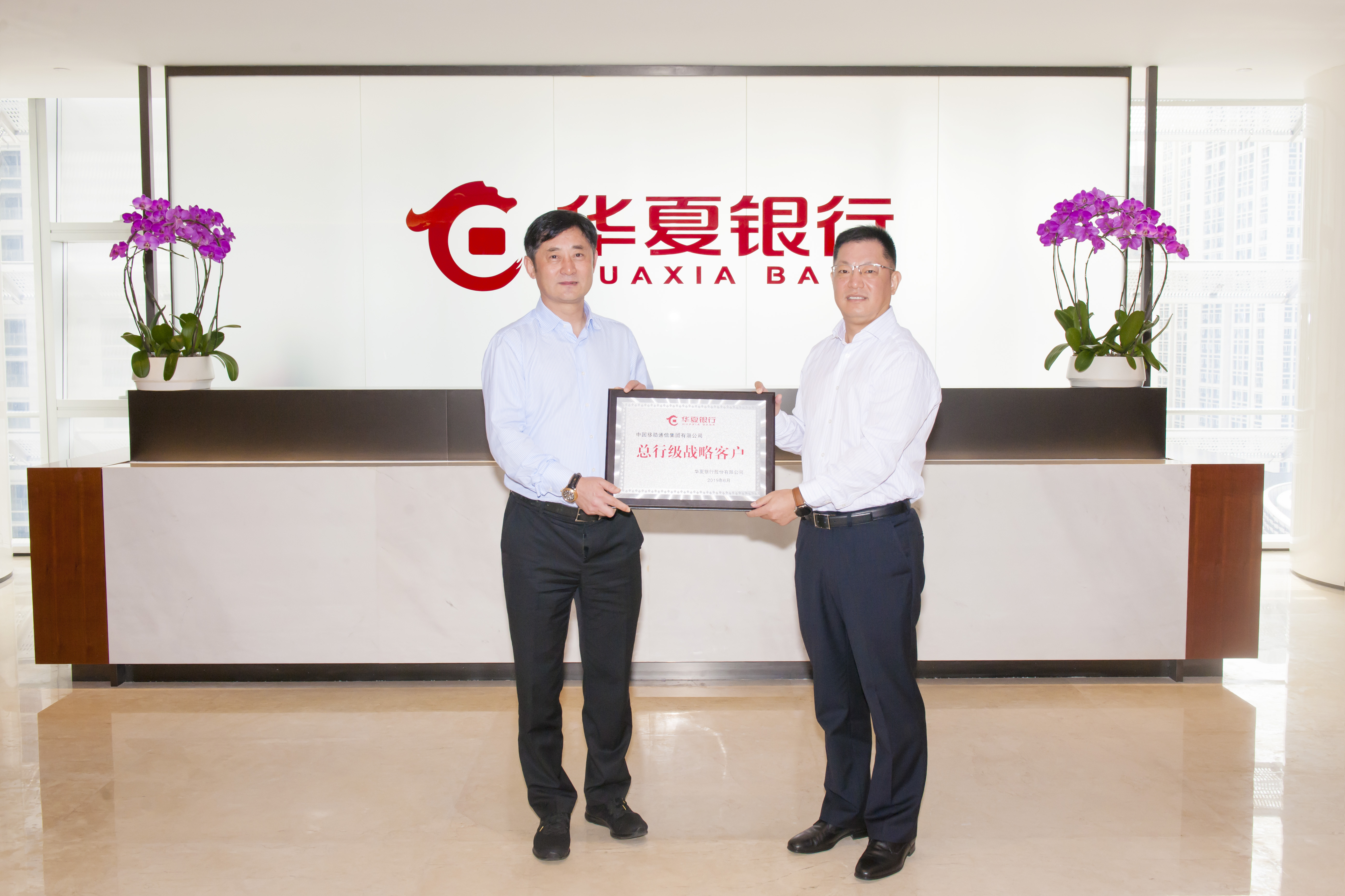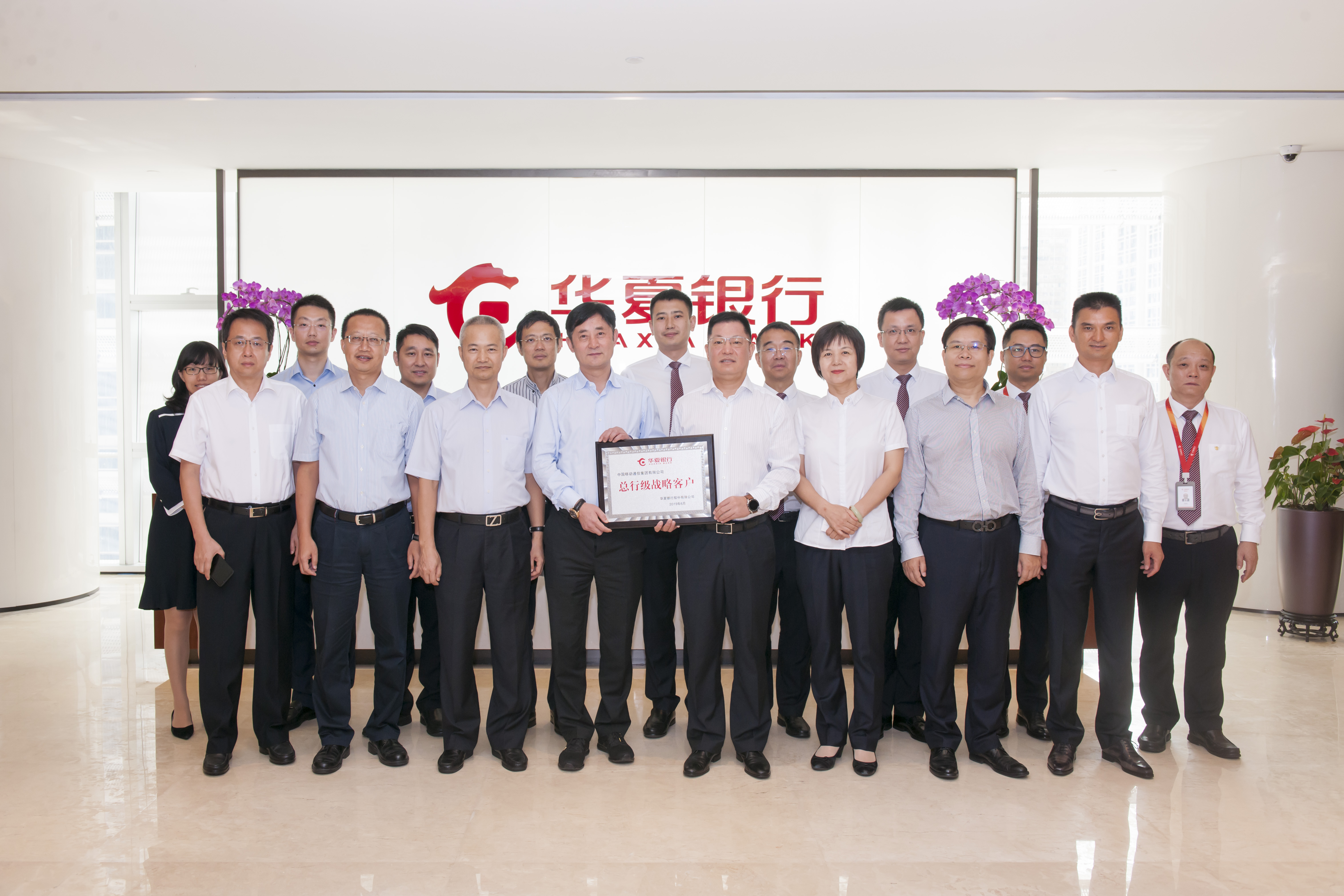 簽約儀式前,華夏銀行深圳分行受總行委托向中國移動(dòng)通信集團(tuán)有限公司頒發(fā)“總行級戰(zhàn)略客戶”牌匾。