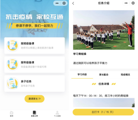 為此,“學(xué)子通”上線了“在家上學(xué)”功能,老師們可根據(jù)實(shí)際需要,選擇“按班級備課”或“按年級備課”,針對班級或年級將錄制好的備課內(nèi)容,如防疫小知識、親子閱讀、親子游戲等內(nèi)容上傳到“在家上學(xué)”模塊,讓孩子“宅”在家中也不停止學(xué)習(xí)的腳步。此外,老師還可通過設(shè)置親子小任務(wù),如一起做青蛙操、讀讀繪本小故事和親子手工藝等,讓家長和學(xué)生一起參與,并可設(shè)置打卡,調(diào)動起學(xué)生的學(xué)習(xí)興趣,既增加親子感情,又讓學(xué)生開展室內(nèi)鍛煉活動、開展課外閱讀,保持良好的身體狀態(tài),讓宅在家中的假期生活變得豐富。