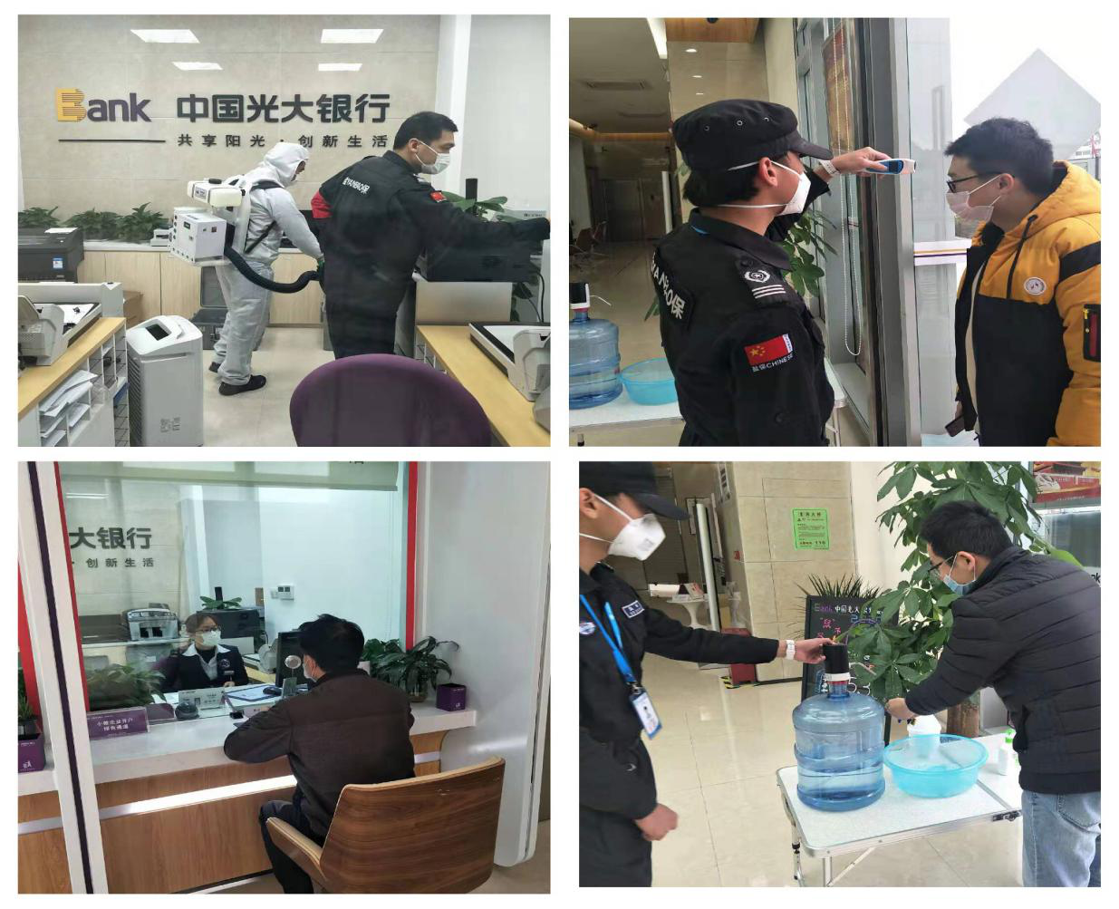 物資保障是防疫工作基礎(chǔ)性工作。復(fù)工之前,支行領(lǐng)導(dǎo)帶隊(duì)落實(shí)復(fù)工所需各項(xiàng)物資準(zhǔn)備情況,指定專人每天對網(wǎng)點(diǎn)進(jìn)行清潔與消毒,在所有客戶會(huì)觸摸到的公共區(qū)域貼上保鮮膜,每日三次消毒更換。要求全體上崗人員佩戴口罩、手套,做好自身防護(hù)。同時(shí),支行根據(jù)自身?xiàng)l件,在門口設(shè)置流動(dòng)水、洗手液、消毒液、紙巾、口罩回收簍等,在客戶進(jìn)入網(wǎng)點(diǎn)時(shí),要求必須佩戴口罩、測量體溫、進(jìn)行洗手登記,切實(shí)做好客戶安全防護(hù)。
