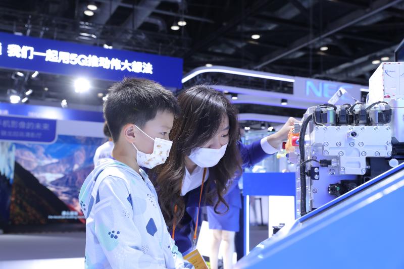 在服貿(mào)會(huì)現(xiàn)場(chǎng),一個(gè)小男孩躲在奶奶身后好奇的地望著中國(guó)太保展臺(tái)上的氫能源發(fā)動(dòng)機(jī)。