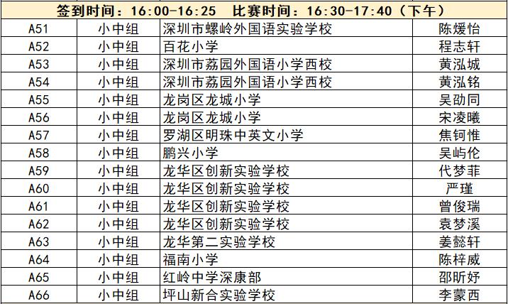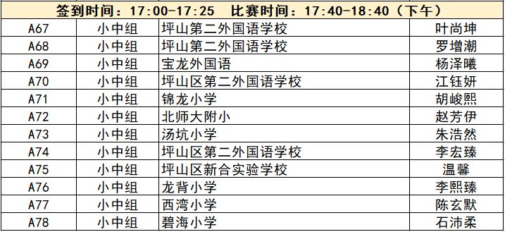 “誰(shuí)是故事大王·第五季”分為小中組和小高組,此次中行特約專(zhuān)場(chǎng)海選報(bào)名的學(xué)生將以脫稿的形式,不限主題,在限時(shí)5分鐘內(nèi),講述積極健康向上的故事。評(píng)委老師們將從四個(gè)維度進(jìn)行評(píng)分,其中內(nèi)容占50%、表現(xiàn)技巧占30%、儀態(tài)占10%,以及時(shí)間掌控、創(chuàng)意特色呈現(xiàn)等占10%。最終,本場(chǎng)活動(dòng)將選拔出部分學(xué)生晉級(jí)“誰(shuí)是故事大王·第五季”深圳市復(fù)賽,他們將和來(lái)自指定校園分賽區(qū)、特約專(zhuān)場(chǎng)以及線(xiàn)上分賽區(qū)的選手一起爭(zhēng)奪深圳市決賽名額?,F(xiàn)將上場(chǎng)順序(即所在小組的序號(hào)順序)、名單、簽到時(shí)間、比賽時(shí)間公布如下:
