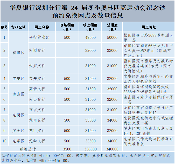 華夏銀行深圳分行共10家網(wǎng)點承辦冬奧紀念鈔發(fā)行工作。為方便老年客戶預約紀念鈔,該行7家網(wǎng)點開放線下預約,市民可持有效的第二代居民身份證原件至公告的現(xiàn)場預約網(wǎng)點辦理預約。紀念鈔先到先得,額滿為止。