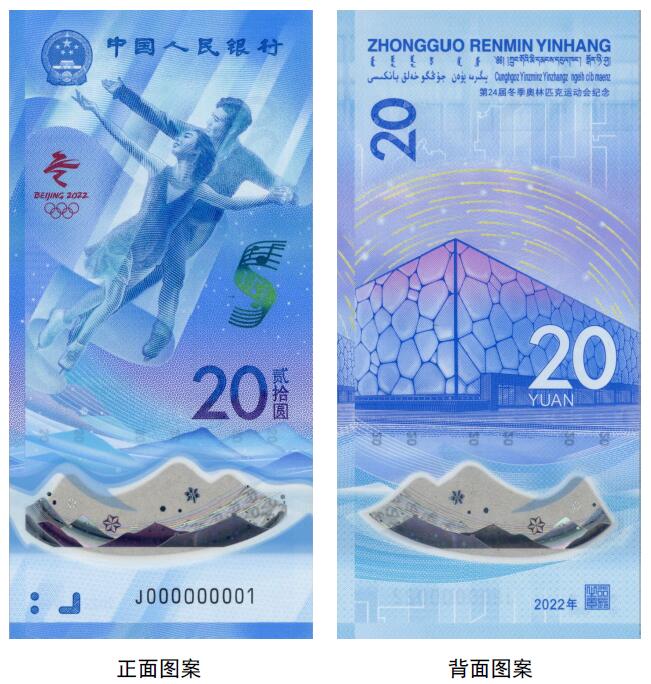 正面圖案:正面主景為花樣滑冰運動員圖案,上方為中華人民共和國國徽、“中國人民銀行”行名,左側(cè)為第24屆冬季奧林匹克運動會會徽,右側(cè)為光彩光變樂譜圖案、面額數(shù)字“20”與漢字“貳拾圓”,下方為動感全息圖案、透明視窗、盲文面額標記和冠字號碼。
