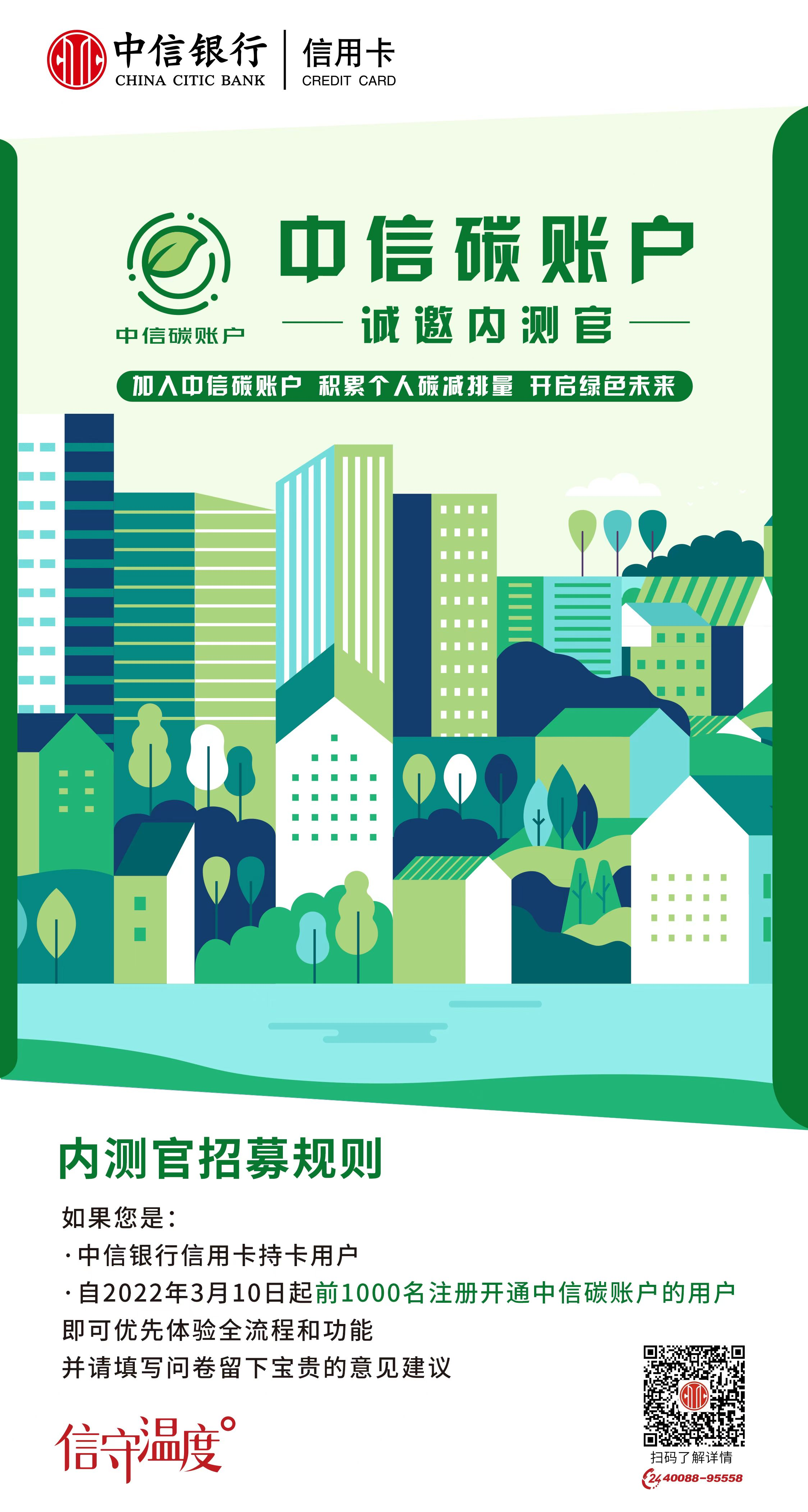 時值中國植樹節(jié)前夕,“中信碳賬戶”內測版現已上線,于3月10日起公開招募1000名用戶參與內測版體驗,首批體驗官登錄中信銀行信用卡“動卡空間”APP,即可在線開通個人碳賬戶,獲取關聯(lián)個人低碳行為的碳減排量,并可對碳賬戶的內測版功能提供優(yōu)化建議。據中信銀行相關負責人介紹,目前,內測版已經上線生活繳費網上辦理(含水費、電費、燃氣費等)、申請電子信用卡、開通電子賬單等低碳行為的碳減排量核算。即將上線的公開版還將包含綠色出行、二手回收等更豐富的綠色低碳生活場景。