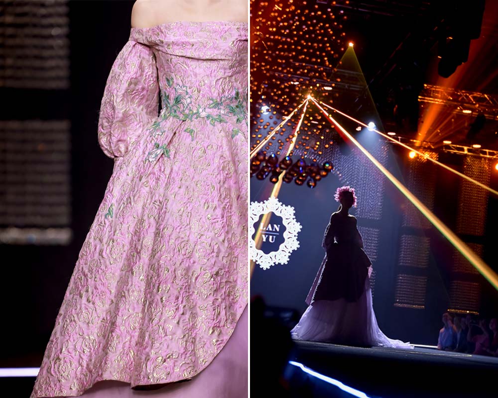 盛典秀場真實還原了巴黎時裝周舞臺,讓觀眾擁有了極致的感官體驗。40余套不同風(fēng)格的禮服傾情展出設(shè)計中如同水墨畫恣意揮灑的筆墨,將山河間幽深、清遠(yuǎn)、縹緲的東方韻味表現(xiàn)得淋漓盡致。