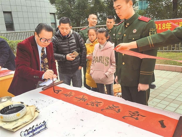 書法家葉自力的“攤位”前人氣也很旺,他主攻“?!弊帧H~自力筆力遒勁,當日他書寫的是“智永體”的福字。每每有官兵或家屬過來求字,寫罷,他都善意提醒,“小心點,端平放,小心墨溢出來了?!碑嫾覄⒄窈.嫷哪档ひ埠堋皳屖帧保┎粦?yīng)求。中藝馨書畫院院長黃漢明表示,春節(jié)降至,組織書畫家到軍營里為官兵以及官兵家屬們揮春,既是送祝福也是文化交流?,F(xiàn)場有求字的官兵表示,這樣的活動很好。(記者 劉莎莎 文/圖)