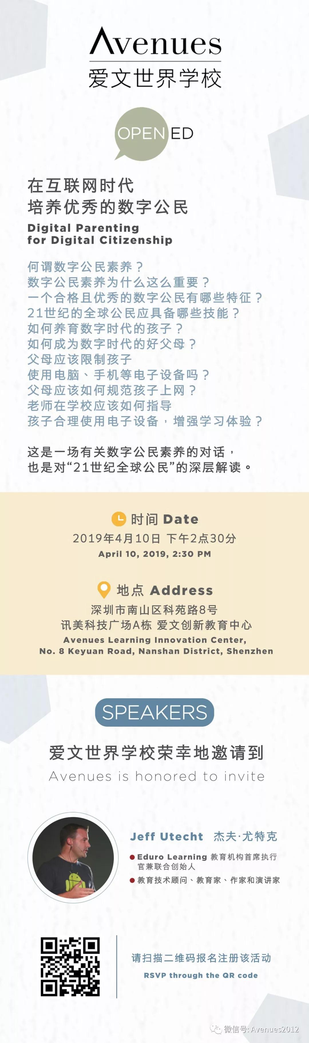 愛文世界學(xué)校專門邀請(qǐng)了知名的教育技術(shù)顧問、教育家、作家及演講家杰夫?尤特克 (Jeff Utecht),就數(shù)字公民素養(yǎng)話題進(jìn)行深入探討,從何謂數(shù)字公民素養(yǎng),到數(shù)字公民素養(yǎng)的重要性,再到父母和老師如何培養(yǎng)孩子成為一位優(yōu)秀的數(shù)字公民。