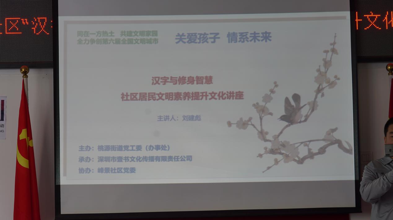 11月8日下午,該項(xiàng)目首場講座在峰景社區(qū)工作站拉開了序幕,本次講座由桃源街道黨工委(辦事處)主辦、深圳市壹書文化傳播有限責(zé)任公司承辦、峰景社區(qū)黨委協(xié)辦,邀請(qǐng)到壹讀書會(huì)創(chuàng)始人、知名閱讀推廣人、《漢字與修身智慧》的作者劉建彪擔(dān)任主講嘉賓。在深圳爭創(chuàng)全國文明城市的當(dāng)下,桃源街道辦積極響應(yīng)市委市政府的號(hào)召,不斷探索籌劃、推陳出新,以“‘同在一方熱土共建文明家園’——全力爭創(chuàng)第六屆全國文明城市”為文明創(chuàng)建標(biāo)語,開展題為“學(xué)習(xí)漢字與修身智慧,以傳統(tǒng)文化力量促文明”的文化講座,為創(chuàng)建文明城市貢獻(xiàn)一份力量。