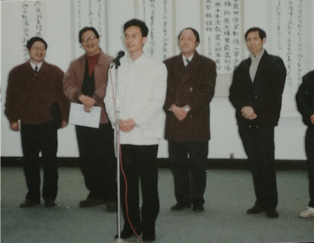 1996年組織深圳市青年書法家赴江蘇省美術(shù)館舉辦《深圳青年書法展》。這是深圳特區(qū)成立以來深圳青年書法家第一次到外省集體亮相交流,圖為金龍?jiān)陂_幕式上致詞。