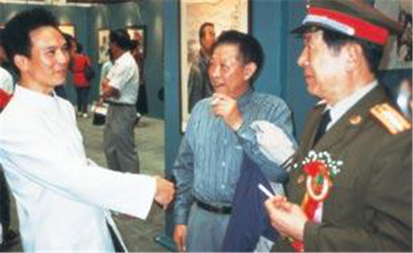 時任深圳警備區(qū)司令李友烈(右)在金龍陪同下參觀畫展。
