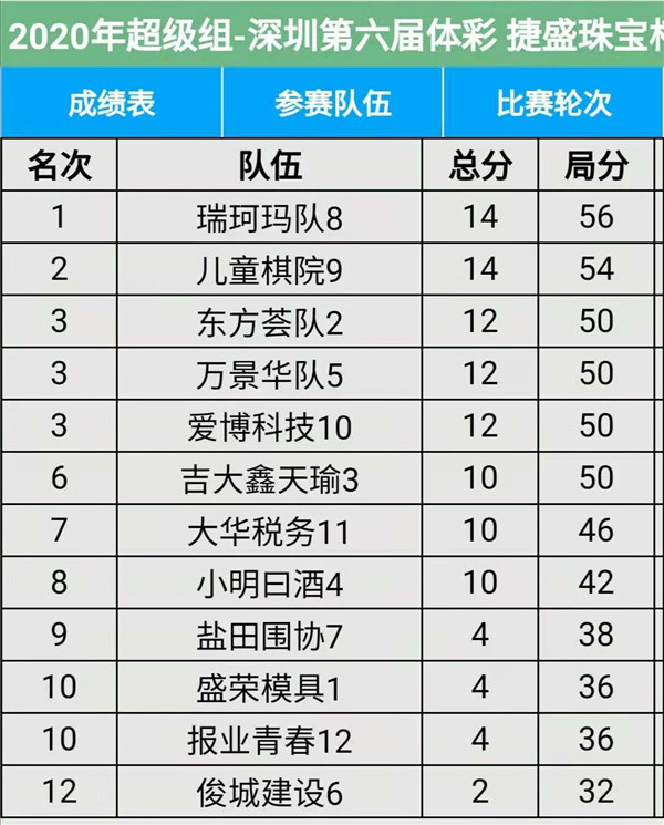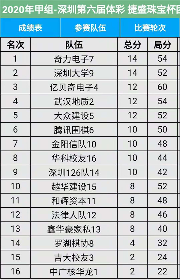 見圳客戶端?深圳新聞網(wǎng)2020年11月15日訊(記者周錦春)第六屆“體彩?捷盛珠寶杯”深圳市圍棋聯(lián)賽繼續(xù)在羅湖區(qū)藝嘉大酒店展開,今天是第三場(chǎng),有第7輪至第9輪的比賽。目前,超級(jí)組中,瑞珂瑪隊(duì)、兒童棋院隊(duì)在積分榜上排名第一第二,繼續(xù)領(lǐng)先;甲級(jí)組中,奇力電子、深圳大學(xué)在積分榜上排名第一第二。具體賽程結(jié)果請(qǐng)看本文附后表格。