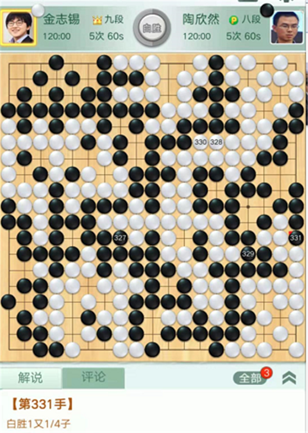 第二臺主將臺,由深圳隊陶欣然八段執(zhí)黑對陣衢州隊韓國外援、世界冠軍金志錫九段。開局下方戰(zhàn)斗雙方各有失誤,局面依然均勢。之后左上角形成打劫,白棋棄劫右上打穿黑空各有所得。黑棋攻擊左上角白棋時候白棋應(yīng)對失誤,黑棋取得領(lǐng)先。白棋看到形勢不利放出勝負(fù)手,打入上邊黑空過分,黑棋反擊后白棋極其危險。關(guān)鍵時候黑棋鼠標(biāo)點錯,給自己留下一個斷點,被白棋活出后,局面難以挽回,陶欣然執(zhí)黑1又1/4子負(fù)金志錫。