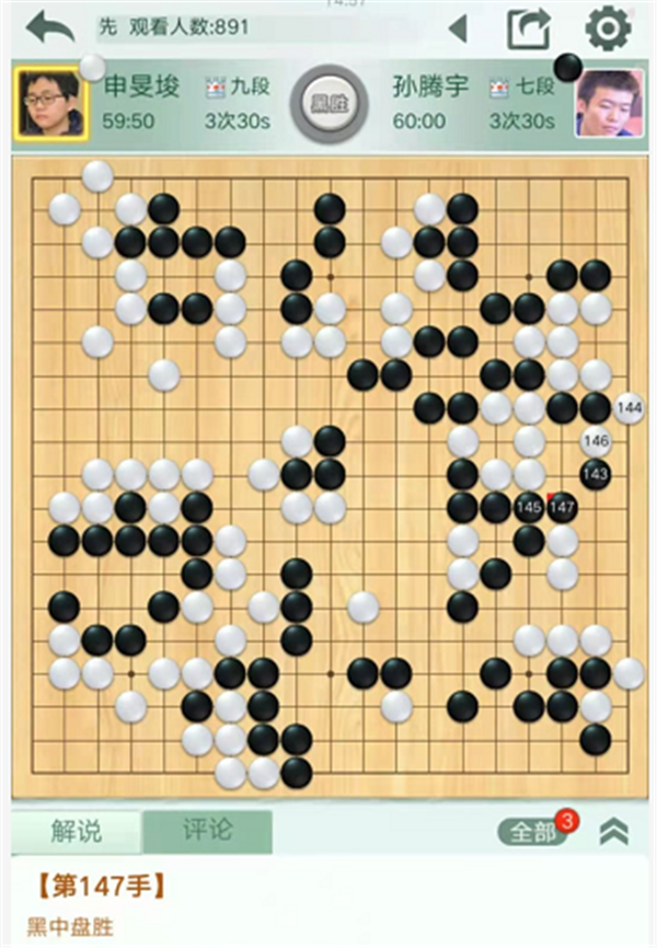 第一臺(tái)快棋,由深圳隊(duì)外援申旻埈九段執(zhí)白對(duì)陣民生隊(duì)的孫騰宇七段。白棋開局順暢,中盤下邊雙方小有失誤,依然白棋領(lǐng)先。之后白棋良好的掌握局面,優(yōu)勢(shì)擴(kuò)大。進(jìn)入官子,白棋沒(méi)有補(bǔ)掉隱患,進(jìn)入中央破黑空時(shí)較為沖動(dòng),選點(diǎn)失誤造成虧損。最后被黑右邊進(jìn)入白空后反殺白棋,申旻埈執(zhí)白中盤負(fù)孫騰宇。