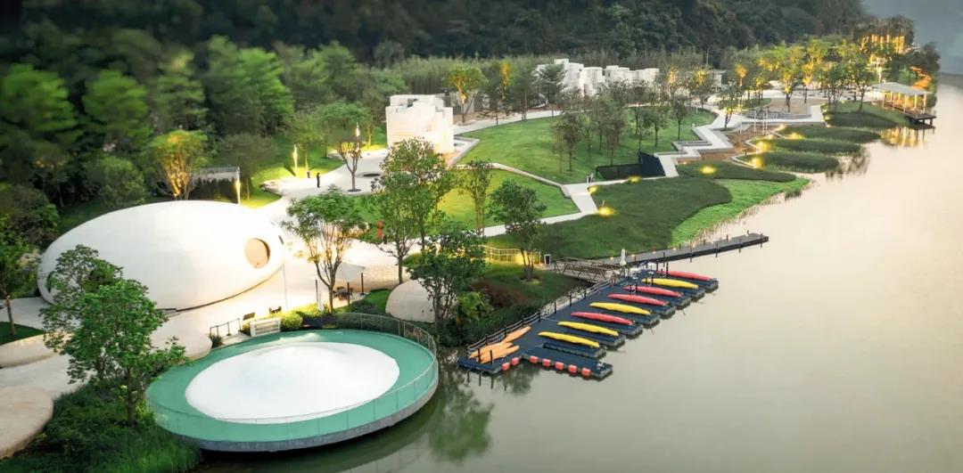 小鎮(zhèn)除規(guī)劃有安藤忠雄禮堂四部曲之一的“詩之禮堂”,還邀請了國內(nèi)外一眾頂級設計師參與設計,張?zhí)凭坝^作品——龍骨樂園、WATG作品——棕櫚樹酒店、鄭東賢作品——高街,還有MORSE COFFEE、社交廚房、深夜食堂等配套建筑,實現(xiàn)居住、休閑、度假、教育、社交和精神文化等空間一體融合,締造了大灣區(qū)首選的深度休閑度假目的地。