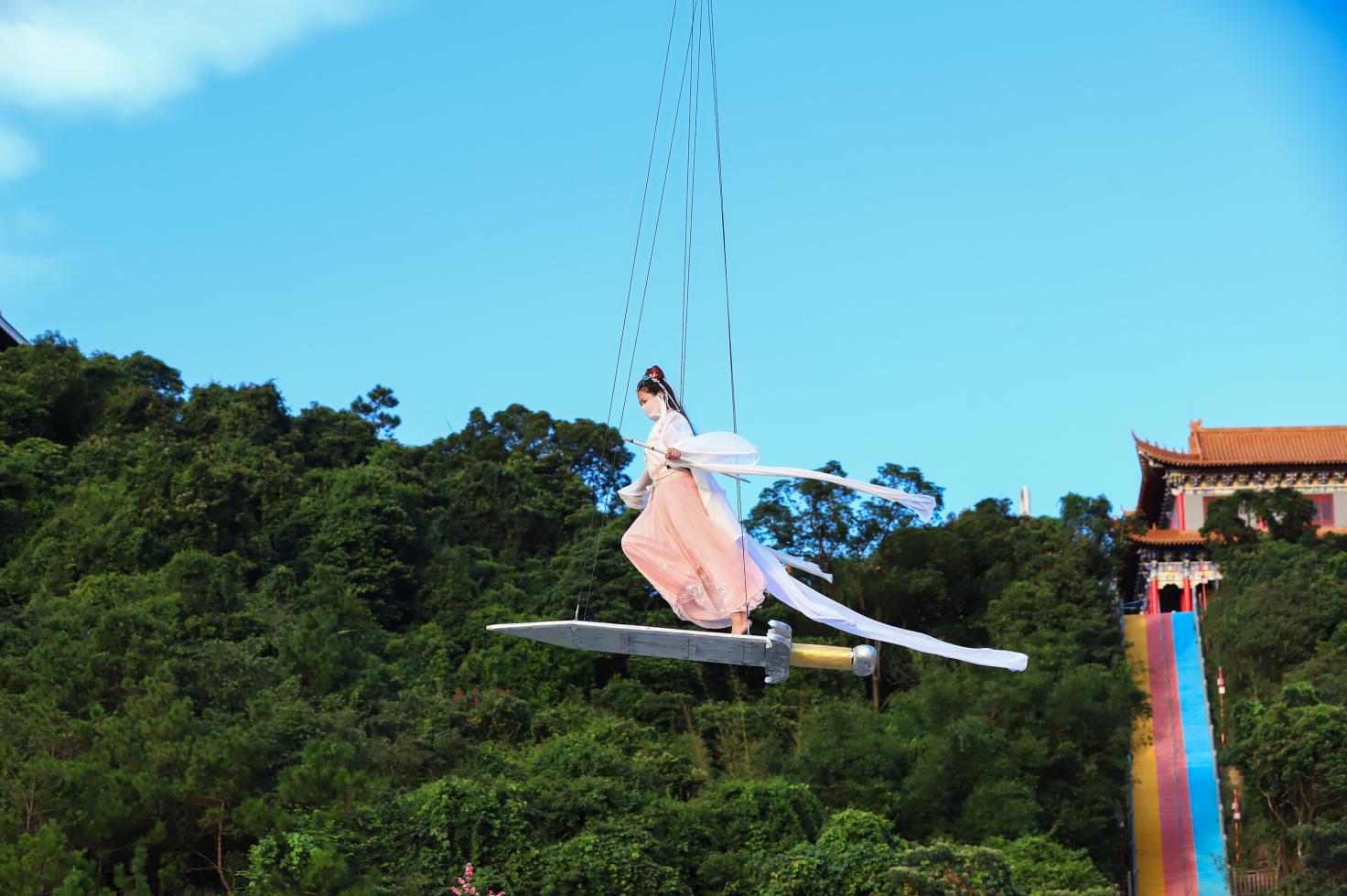 此外,觀音山上還能“御劍飛行”啦!一經(jīng)推出,瞬間成為全網(wǎng)飛天體驗(yàn)中的一股清流,吸引眾多網(wǎng)友的關(guān)注,不禁感嘆,花式之豐富有趣。作為抖音爆火的項(xiàng)目網(wǎng)紅飛天威亞,一直以來備受游客青睞!國慶期間,來觀音山,飛天威亞還能玩出新花樣,為游客提供御劍飛行模式,打造獨(dú)特飛天體驗(yàn)!