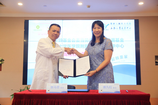 中國宋慶齡基金會唐九紅部長(右),國家兒童醫(yī)學中心(上海兒童醫(yī)學中心)張馬忠副院長(左)簽署雙方戰(zhàn)略合作協(xié)議