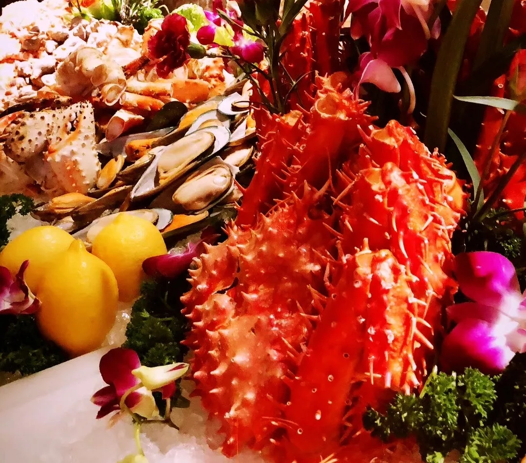 生猛龍蝦、阿拉斯加蟹腳、九節(jié)蝦、三文魚(yú)刺身
