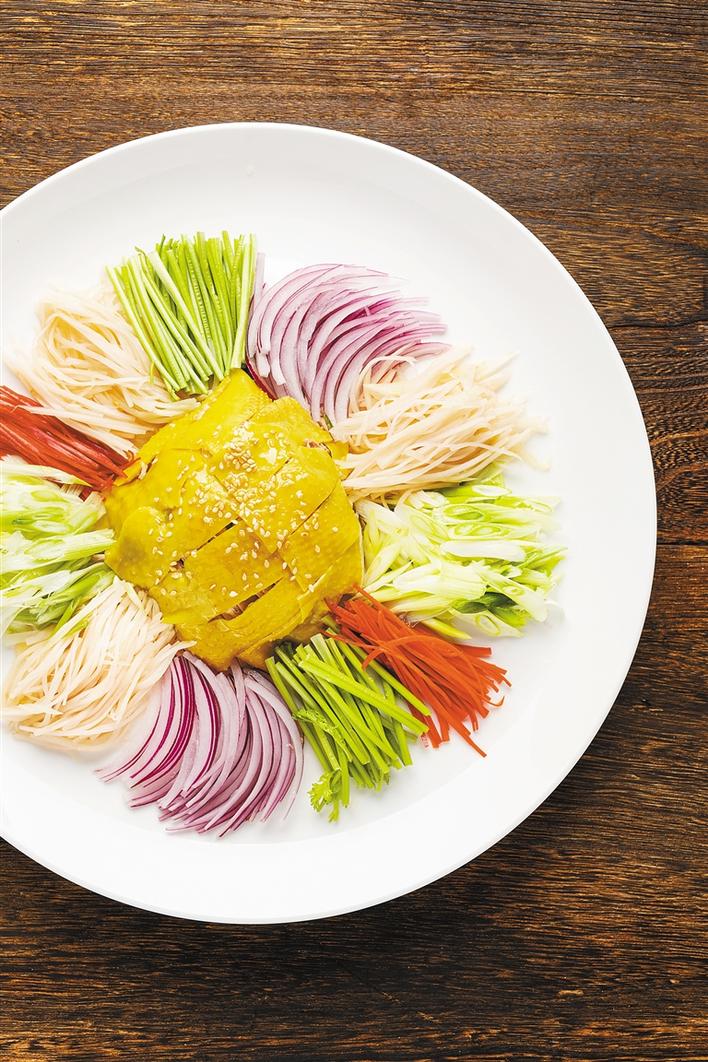 “撈”在粵語中有工作有錢賺的意思,祝愿來年風(fēng)生水起。徐師傅采用遠(yuǎn)近馳名的葵花雞??u顧名思義,由新鮮的葵花盤、葉、桿等炮制而成的飼料喂養(yǎng),以葵花桿榨成的汁解渴,是十足的“雞中貴族”。徐師傅選用講究的雞肉來準(zhǔn)備這道講究的菜,寓意前來用餐的賓客在來年可以步步高升、事事順利。將葵花雞、子姜絲、洋蔥絲、香菜段等各式新鮮食材撈到一起,齊齊起筷,高呼:“齊齊撈起,撈到風(fēng)生水起!”
