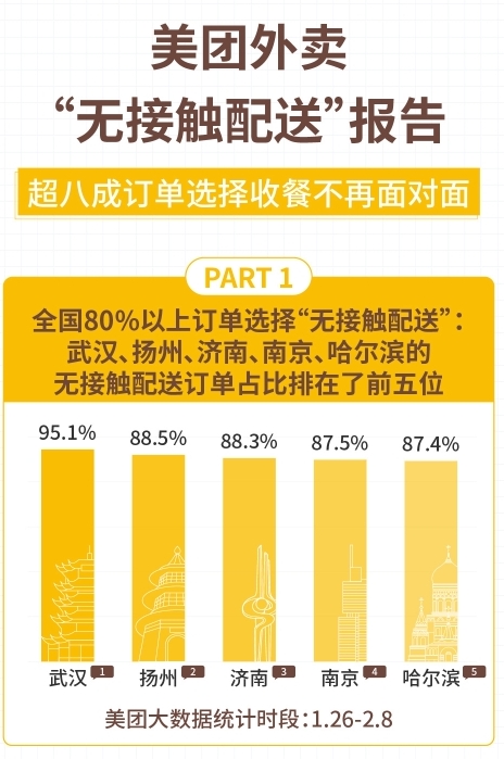 報(bào)告顯示,在1月26日至2月8日期間,在使用“無(wú)接觸配送”服務(wù)占比最高的城市中,武漢、揚(yáng)州、濟(jì)南、南京、哈爾濱排在了前五位。從用餐人數(shù)來(lái)看,2人份及以上餐食占總體訂單的比例相比較平時(shí)增長(zhǎng)了31.7%。采用“無(wú)接觸配送”的訂單占到了整體單量的80%以上,且每一單外賣(mài)都使用“無(wú)接觸配送”服務(wù)的用戶占到66%。