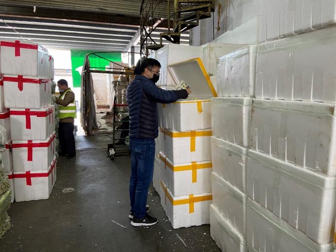市場(chǎng)的檔主、物流車司機(jī)、加工工人,全部都帶上口罩,看新聞講跟人講話要保持距離,但忙起來(lái)真顧不了那么多,大家都在“搶貨”,這頭跟檔主商量好,那頭貨可能被拉走了?!柏浺阶约旱募庸ぶ行?,才算是你的?!币?yàn)榇汗?jié)批發(fā)市場(chǎng)的檔口工人回去一大半了,沒人送貨,緊張的時(shí)候,有女同事干脆自己借一輛三輪車,把談好的貨源直接拉走。