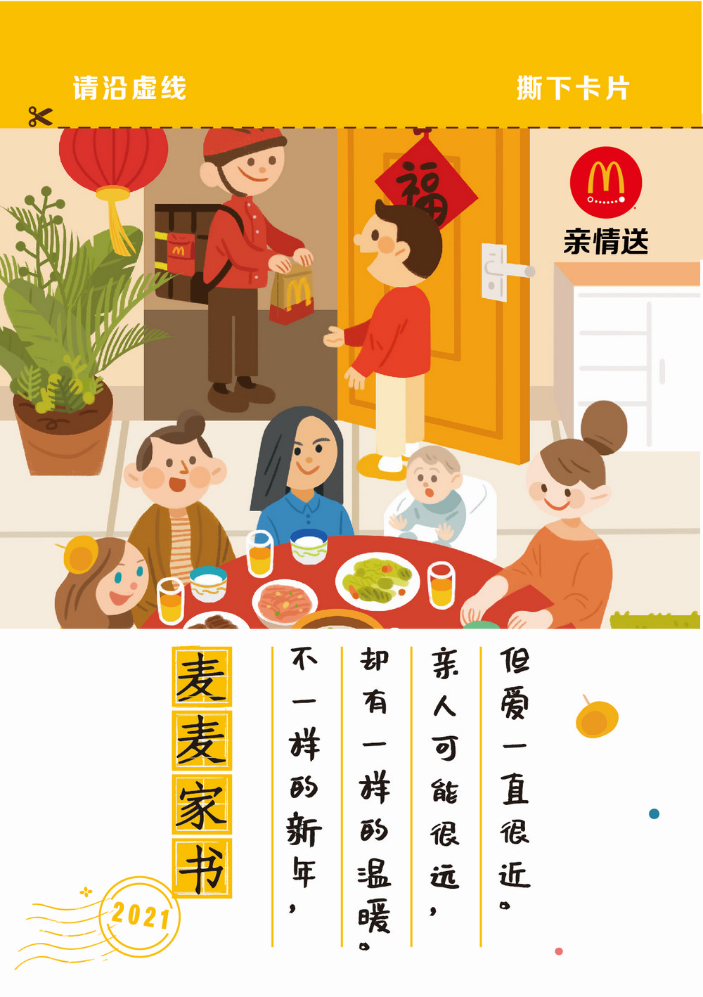 為了讓分隔兩地的顧客表達對彼此的思念和祝福,麥樂送于春節(jié)期間推出“親情送”服務。2月10日至2月17日,在i麥樂送小程序、麥當勞App、美團麥當勞店鋪、餓了么麥當勞店鋪,顧客可以選擇“親情送”服務,為遠在異地的親人朋友點餐,麥樂送會在訂單中附上【親情卡】,消費者可以定制祝福,卡片連同美食將一齊送達你思念的人手中。