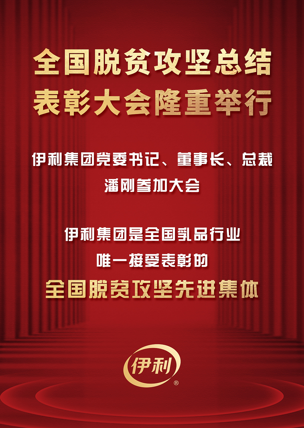 2月25日,全國(guó)脫貧攻堅(jiān)總結(jié)表彰大會(huì)在北京隆重舉行。伊利集團(tuán)是乳品行業(yè)全國(guó)脫貧攻堅(jiān)先進(jìn)集體唯一獲獎(jiǎng)企業(yè)。