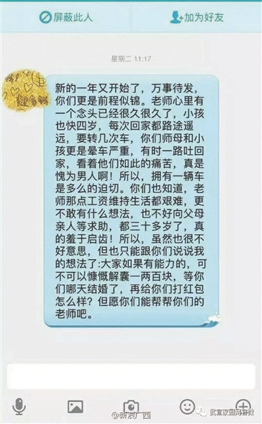 爆料帖中同時(shí)上傳了多張聊天記錄,其中一張顯示:“新的一年又開始了,萬事待發(fā),你們更是前程似錦。老師心里有個(gè)念頭已經(jīng)很久了,小孩也快四歲了,每次回家都路途遙遠(yuǎn),要轉(zhuǎn)幾次車,你們師母和小孩更是暈車嚴(yán)重,有時(shí)一路吐回家,看看他們?nèi)绱送纯?,真是愧為男人啊!所以,擁有一輛車是多么的迫切。你們也知道老師那些工資維持生活都很艱難,更不敢有什么想法,也不好向父母親人求助,都三十多歲了,真的羞于啟齒!所以,雖然也很不好意思,但是也只能跟你們說說我的想法了:大家如果有能力的,可不可以慷慨解囊一兩百塊,等你們哪天結(jié)婚了,再給你們打紅包怎么樣?但愿你們能幫幫你們的老師吧。”