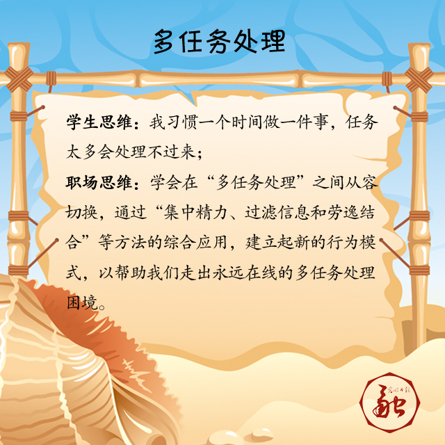 職場(chǎng)思維:學(xué)會(huì)在“多任務(wù)處理”之間切換,通過(guò)“集中精力、過(guò)濾信息和勞逸結(jié)合”等方法的綜合應(yīng)用,建立起新的行為模式,以幫助我們走出永遠(yuǎn)在線的多任務(wù)處理困境。
