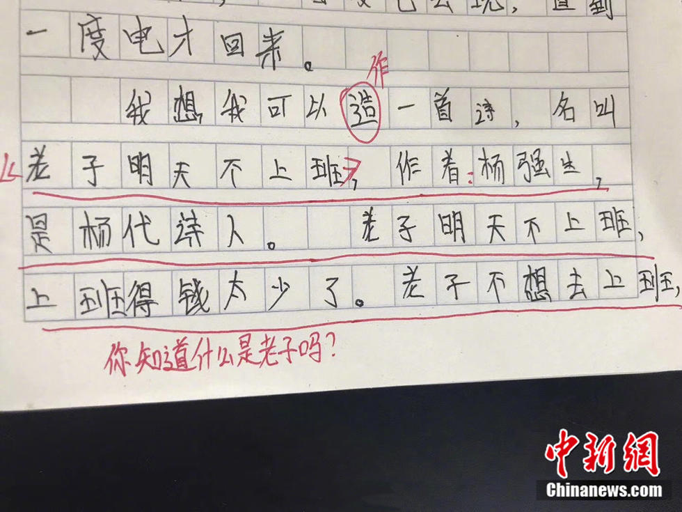 近日,貴州省谷隴翁板小學(xué)的語文老師張沁文,曬出了學(xué)生寫在作業(yè)里的“金句”?!袄蠋煟闾詰倭?,QQ空間都是自己照片”;“顏值升高才有人喜歡您”……孩子們的童言無忌令人哭笑不得,老師的評論也很亮眼。