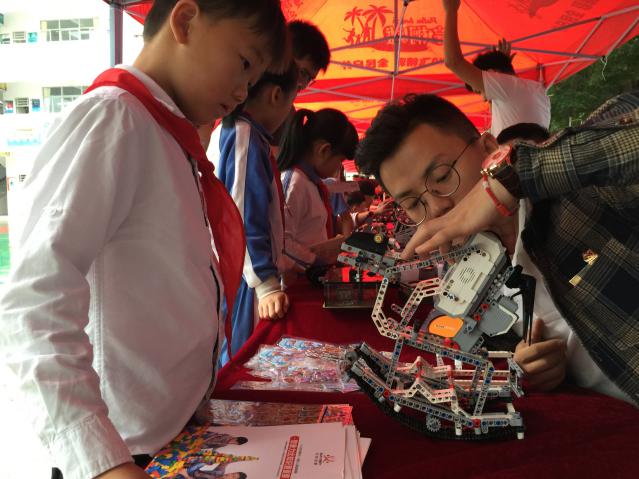 同期,愛匯百變教育科技有限公司也給同學帶來了炫酷多彩的編程大餐。通過對EV3編程機器人項目LEGO方針機械機構(gòu)以及LEGO圖形化編程展示,邀請現(xiàn)場同學進行對套件進行組裝、編程控制,普及編程和電磁感應(yīng)現(xiàn)象、電動基本原理、電路等物理知識,鍛煉學生科學創(chuàng)造思維,培養(yǎng)學科興趣。