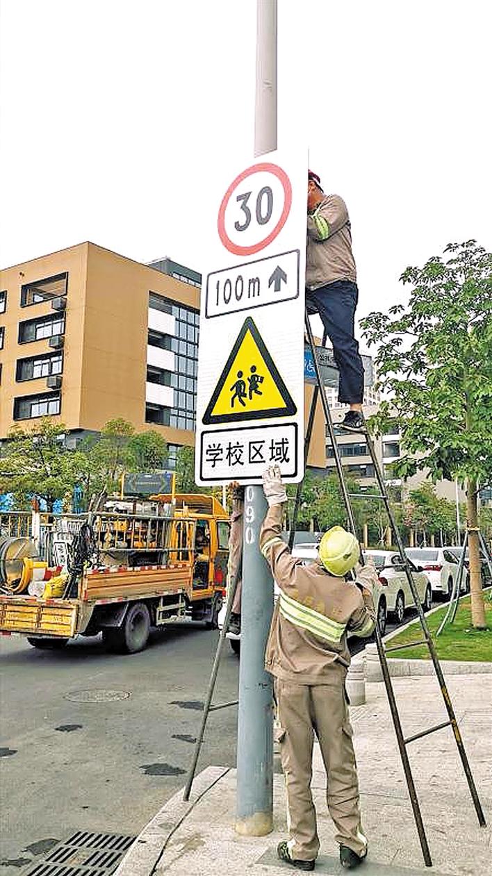 交通設(shè)施維護工人在龍華區(qū)龍騰學(xué)校周邊道路安裝提示牌。