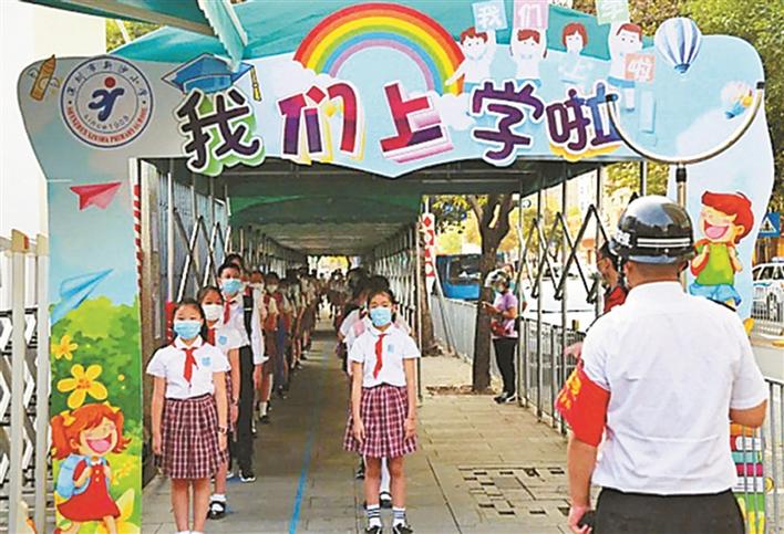 健康副校長(zhǎng)和指導(dǎo)員在新沙小學(xué)指導(dǎo)防疫工作,引導(dǎo)學(xué)生有序入校。
