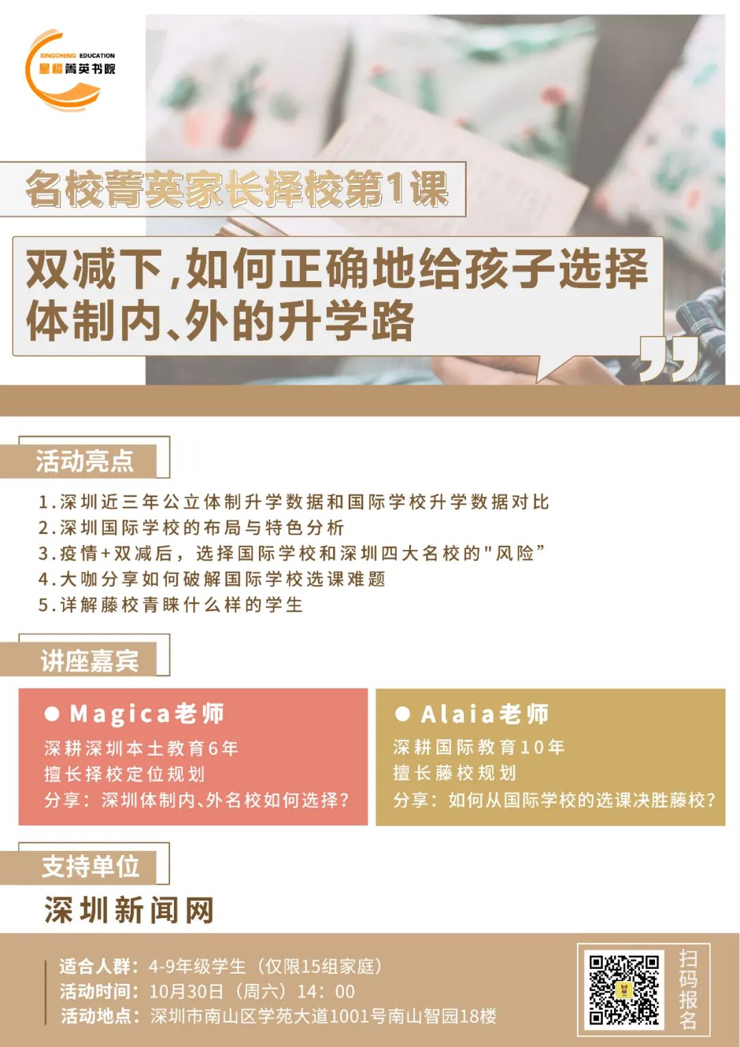 如果家長(zhǎng)們?cè)趽裥7矫嬗幸蓡?wèn),歡迎參加擇校君第一期【名校菁英家長(zhǎng)下午茶】!一起探討:雙減之后,如何正確地給孩子選擇體制內(nèi)、外的升學(xué)路?