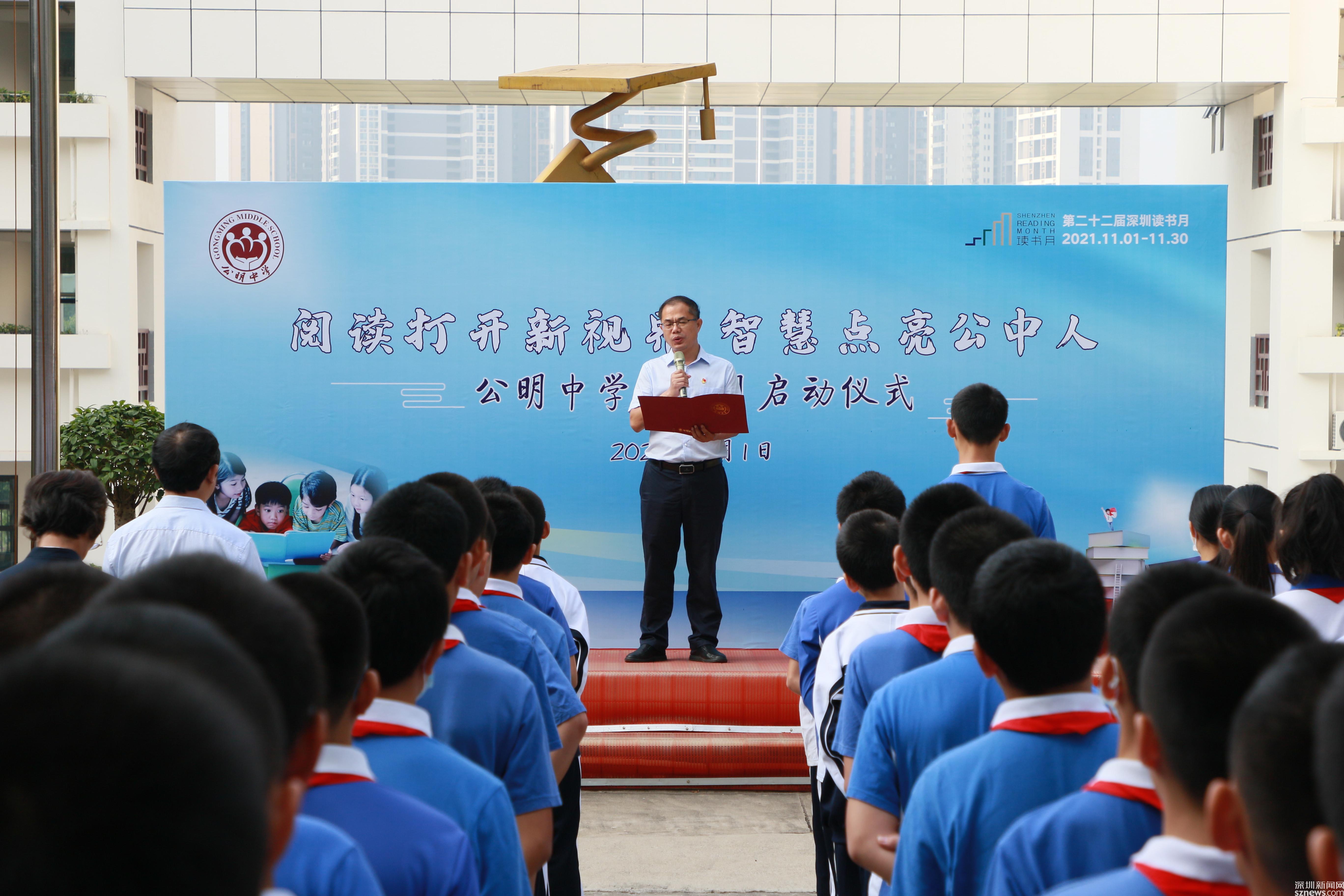 “公明中學(xué)將用閱讀賦予校園知書達理的文化氣息,用知識開闊眼界,用經(jīng)典浸潤心靈,用書為伴博覽同行。”華建明校長指出,深圳正傾力打造具有世界影響力的閱讀文化品牌,公明中學(xué)將以深圳讀書月為依托,由黨員、行政帶頭學(xué)習(xí),做讀書活動的組織者、參與者和引導(dǎo)者,做師生學(xué)習(xí)的表率,鼓勵師生愛讀書,讀好書,學(xué)會讀書,在閱讀中發(fā)揮“恒、勤、思、用”的精神,引導(dǎo)閱讀文化向縱深發(fā)展,在全校形成“專家指導(dǎo)、陣地支持、全員參與”的讀書格局,增厚公中文化底蘊。